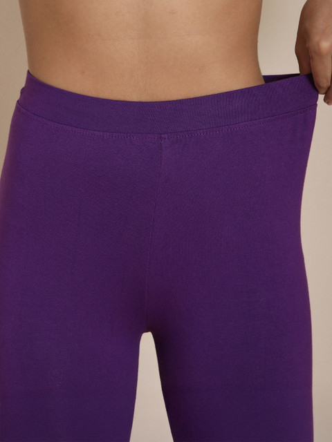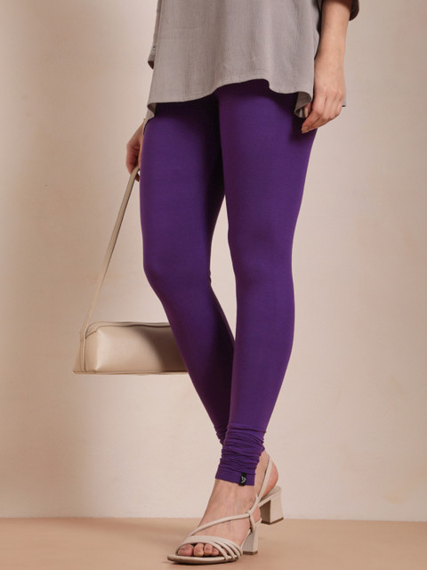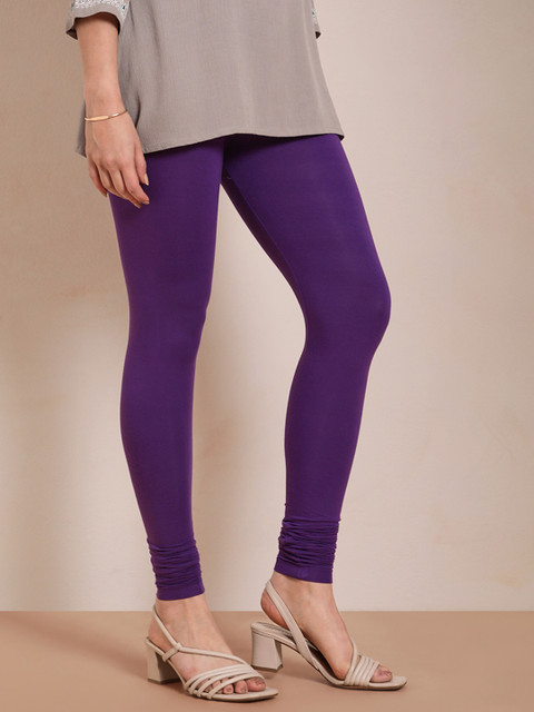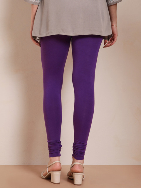 Purple solid churidar-length leggings, has an elasticated waistband and slip-on closure