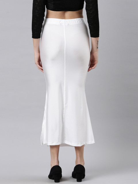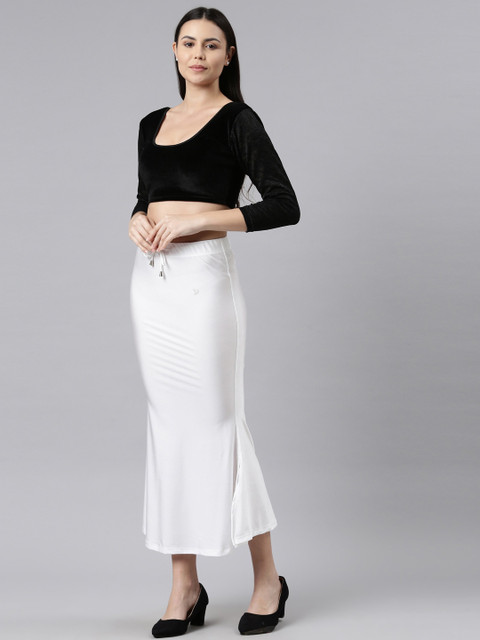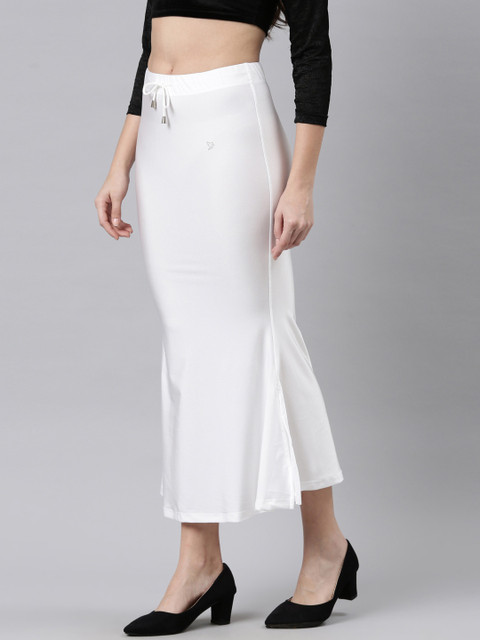 White Shimmer Saree Shaper, silky soft fabric designed for comfort, elegance, and a flattering fit. Define your curves with mermaid flared bottom with a side slit, Wide waistband with an adjustable drawstring ensures tummy control and a secure, custom fit. Perfect for both daily wear and festive occasions.
