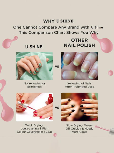 | How-to-Apply | For best results use with u shine base coat. Apply one coat of u shine or any other base coat &, let it air dry quickly. Apply 2 coats of nail polish for true colour coverage. Apply this colour of choice by starting at the center cuticle of your nail. Paint to the tip and then repeat to the left and right of the center swatch. Be sure to cap your nail tip and for extended wearability seal it with our high gloss top coat or any other top coat for an excellent long keep. |