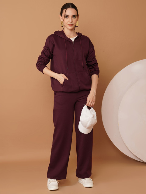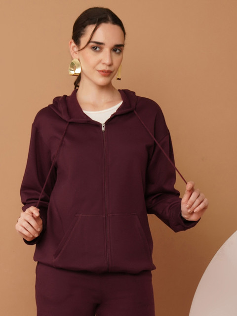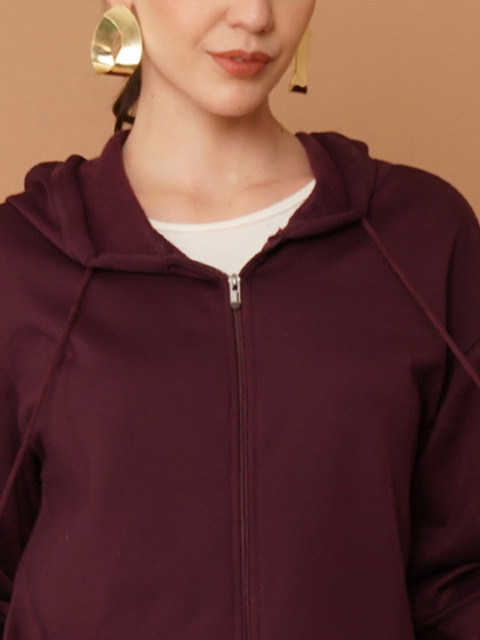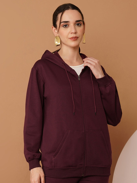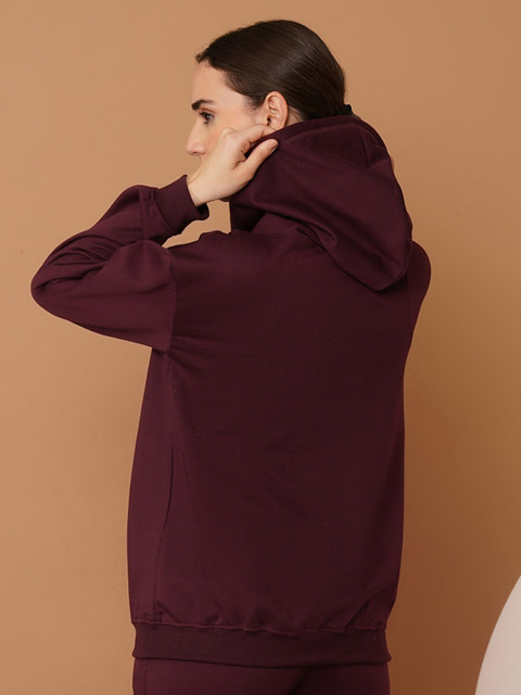 Burgundy solid sweatshirt has a hooded, 2 kangaroo pocket, long sleeves, zip closure, ribbed hem