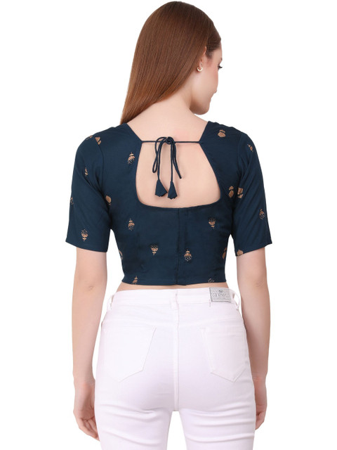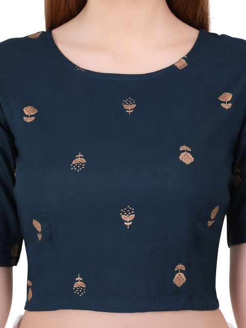 This navy blue printed crop blouse adds the right mix of ethnic charm and contemporary style. Pair it with a saree or lehenga for festive wear, or mix it with white jeans or palazzos for a chic Indo-western look. Add oxidised jewellery or statement earrings to elevate your outfit.