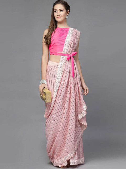 Pink solid saree blouse has a round neck, sleeveless, and tie up closure