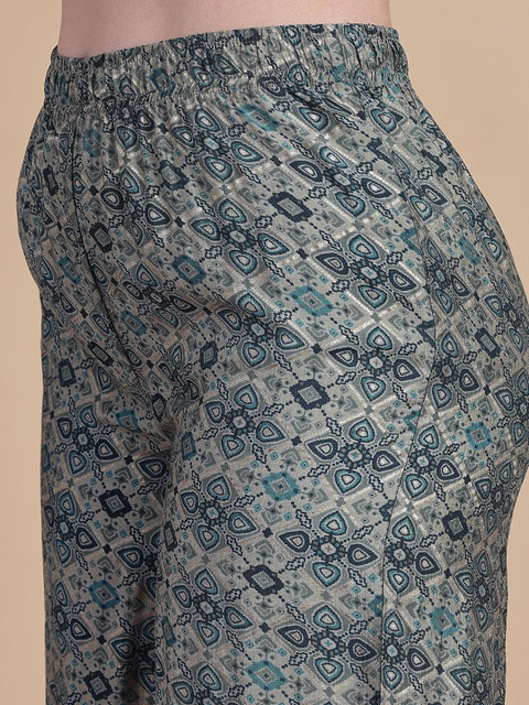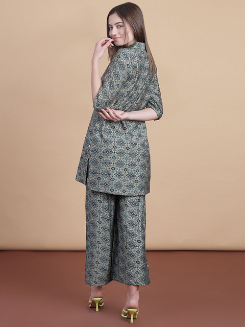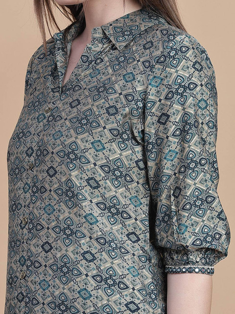 Grey & green printed tunic, has shirt collar & three quarter sleeves