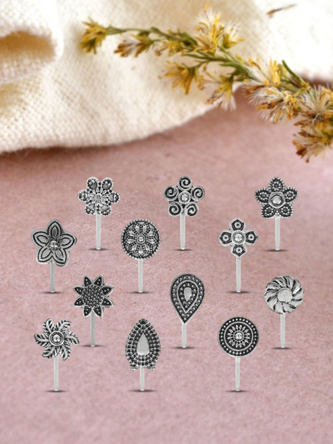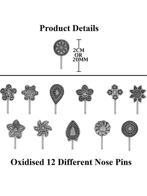 Set of 12 Silver Oxidised Clip-On Nose Pins, designed for women who love ethnic elegance without the need for piercing. These intricately crafted nose pins feature vintage oxidised detailing, making them a perfect addition to any traditional or contemporary outfit.The clip-on mechanism ensures a secure and comfortable fit, making them suitable for festivals, weddings, and everyday wear. Whether paired with sarees, kurtis, or fusion wear, these nose pins effortlessly enhance your style with their timeless appeal.