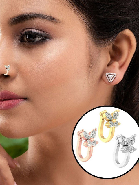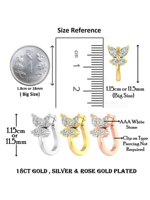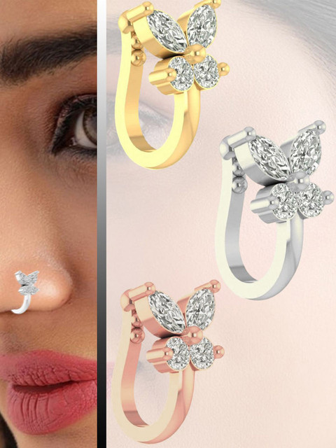 3-piece clip-on nose pin set, featuring a luxurious gold silver and rose gold finish. Designed for women who prefer non-piercing nose rings, this set offers both style and comfort. Each nose pin is crafted from high-quality alloy, ensuring durability and long-lasting shine. The sparkling stones add a touch of elegance, making them perfect for both traditional and contemporary looks. With a secure and comfortable clip-on mechanism, these nose pins are easy to wear throughout the day. Ideal for festive occasions, weddings, parties, or daily wear, this Set is a must-have accessory for every jewellery lover.