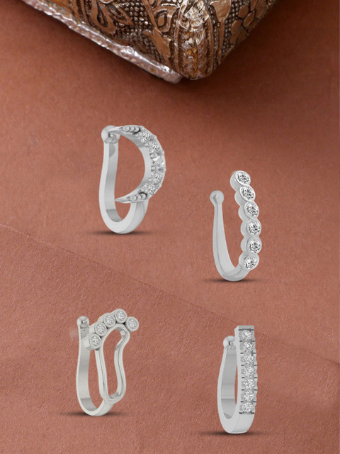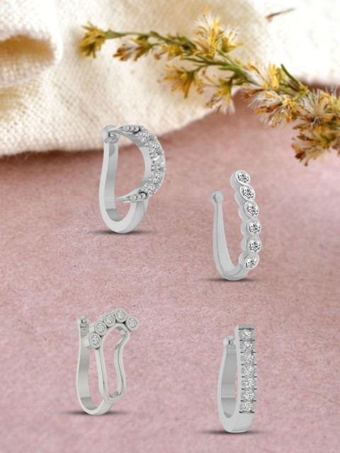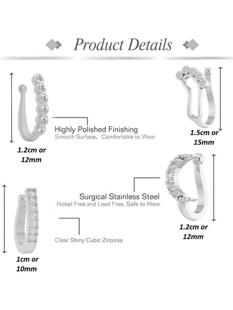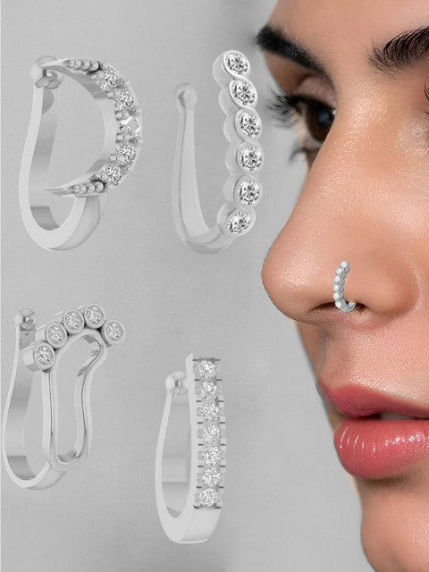 set of 4 clip-on nose pins, perfect for women who prefer a non-piercing option. Crafted with precision, these nose pins feature diamond-like cubic zirconia stones set in a gold-plated finish, The secure clip-on design offers a firm grip without discomfort