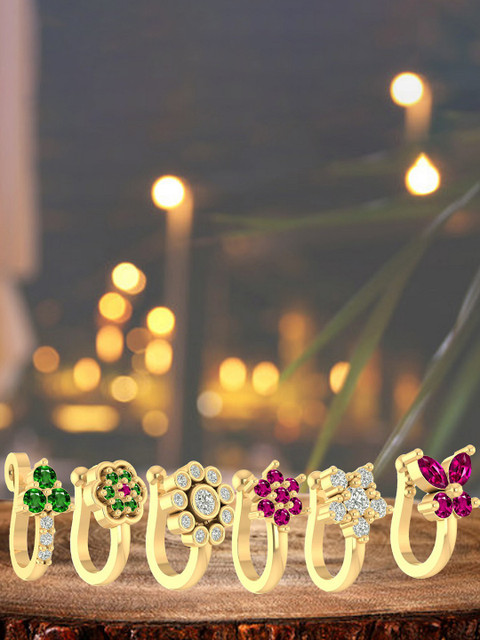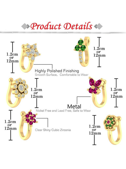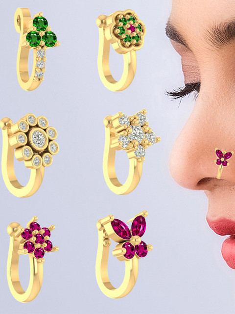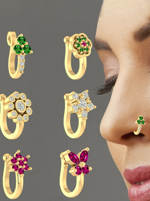 Add a touch of elegance to your look with this Set of 6 Clip-On Nose Pins for Women. Each piece is premium gold-plated for a luxurious finish. The set includes two nose pins adorned with green emerald stones, two with pink ruby stones, and two with white stones, offering a variety of designs to suit every style. These non-piercing nose pins are easy to wear and perfect for any occasion, ensuring comfort and style without the need for piercing. Ideal for women who love to accessorize with unique, trendy, and sophisticated pieces.