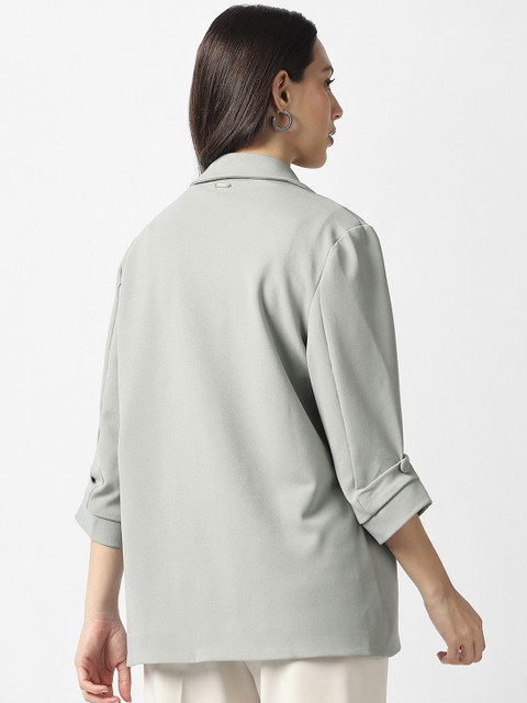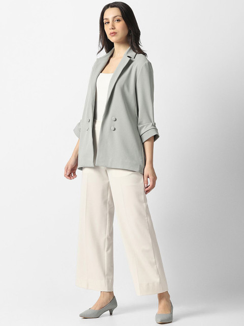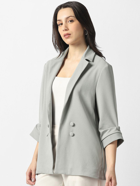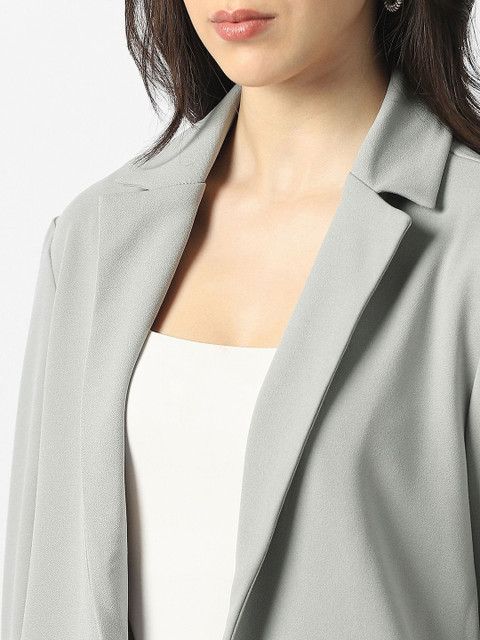 Grey solid regular-fit blazer, has a notched lapel, long sleeves, single-breasted with double button closure, two flap pockets, one welt pocket and a double-vented back hem
