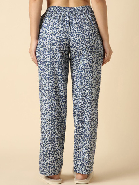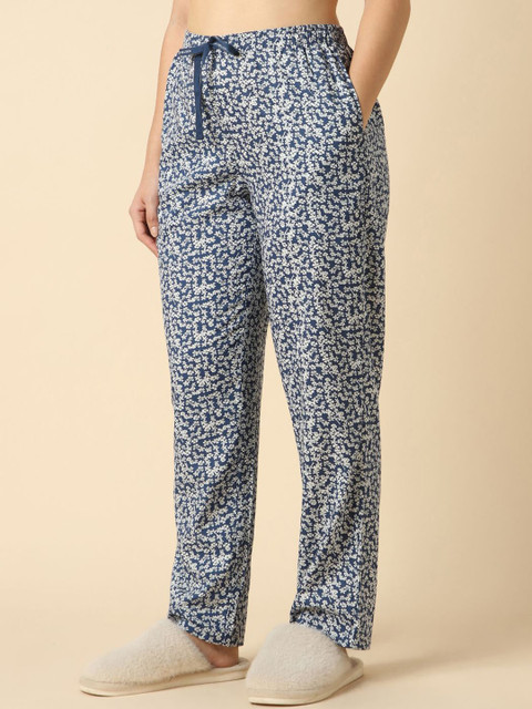 Navy blue & white printed lounge pants, has an inner elasticated waistband with drawstring closure and two pockets