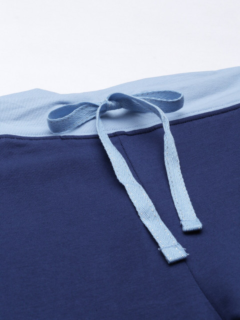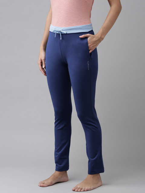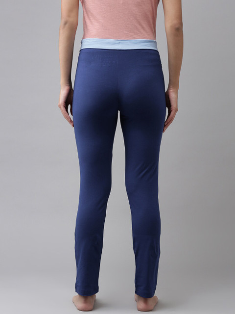 These live-in lounge pants are blue solid, made of cotton stretch offer breathability, soft handfeel & high stretch, 2 zipped pockets, a drawstring.
