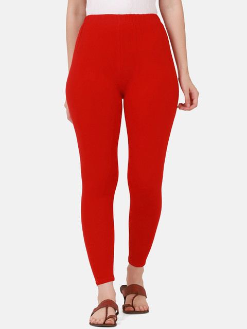 Red solid ankle-length leggings, has an elasticated waistband with slip-on closure