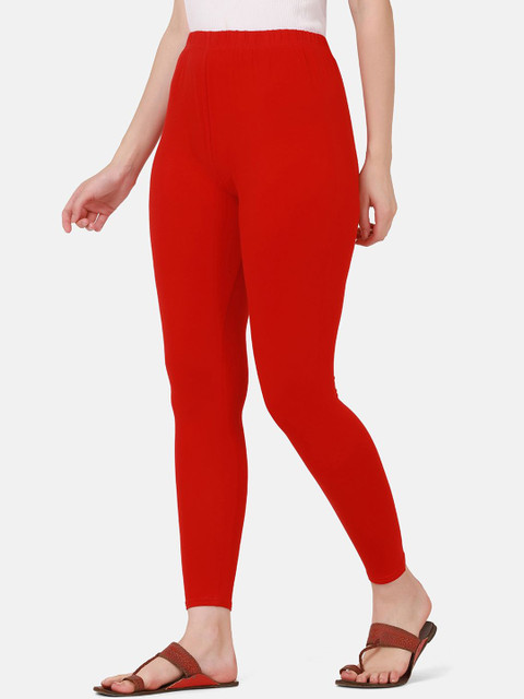 Red solid ankle-length leggings, has an elasticated waistband with slip-on closure