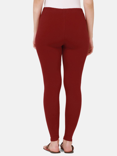 Maroon solid ankle-length leggings, has an elasticated waistband with slip-on closure