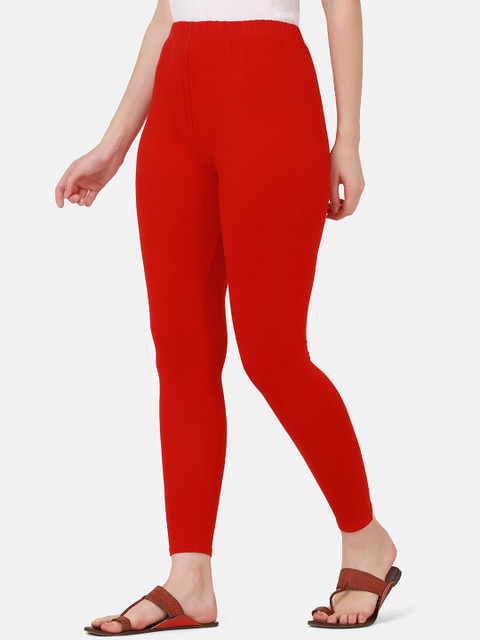 Red solid ankle-length leggings, has an elasticated waistband with slip-on closure