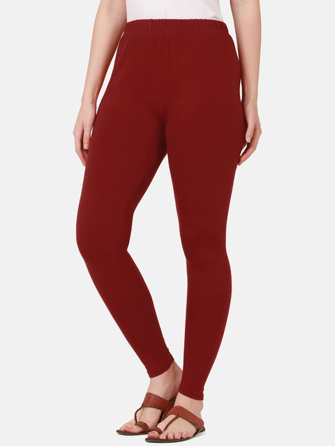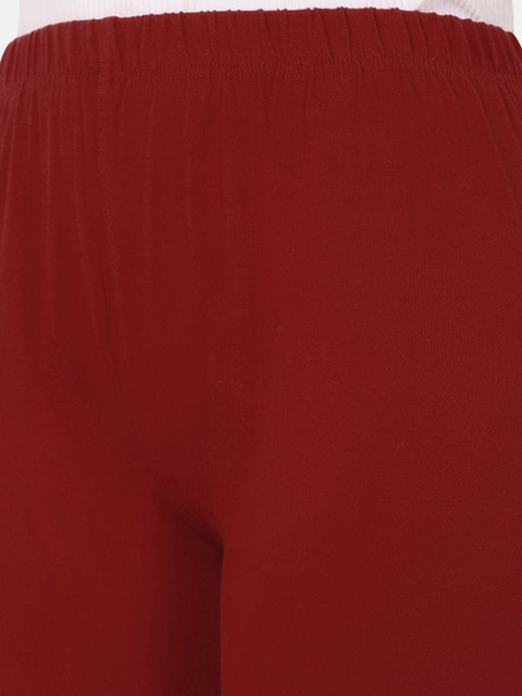 Maroon solid ankle-length leggings, has an elasticated waistband with slip-on closure