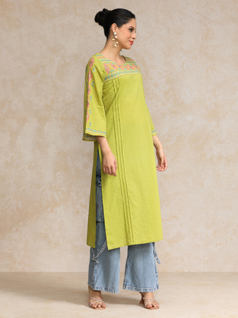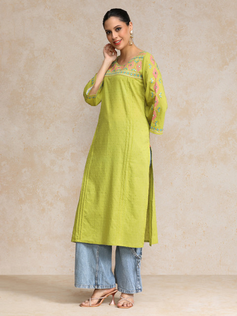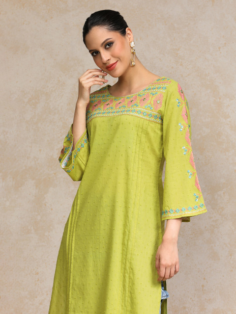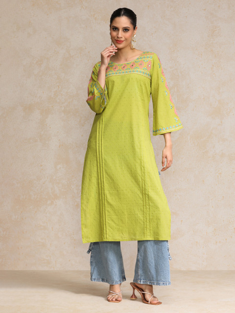 Elegant and comfy, this Varanga cotton kurta features beautiful floral embroidery and stylish bell sleeves, perfect for casual or festive wear.