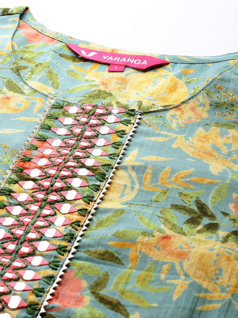 Varanga Floral Printed Mirror Work round neck Pure Cotton Kurta