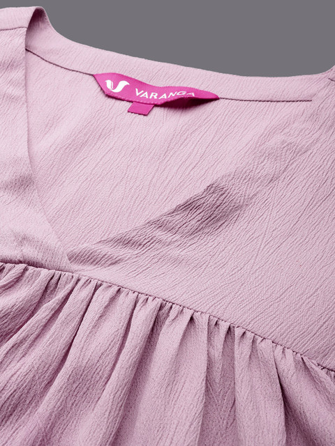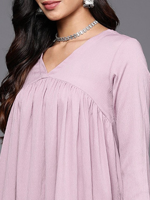 Pink solid tunic has V-neck, three-quarter sleeves, empire gathered details and slip-on closure