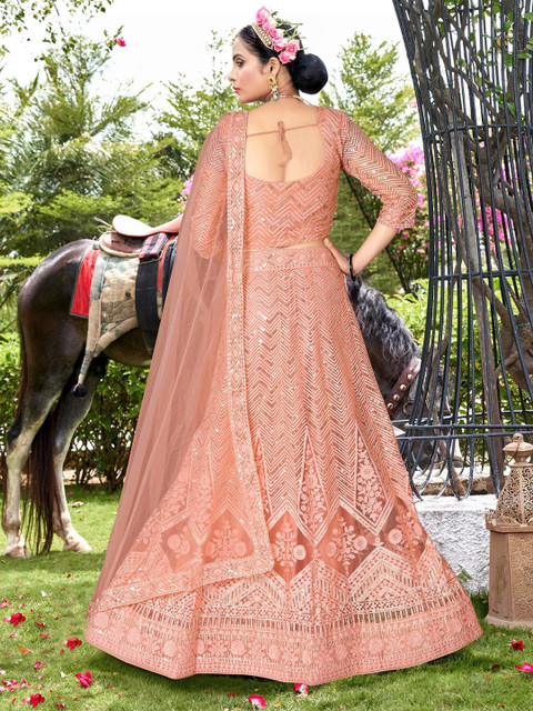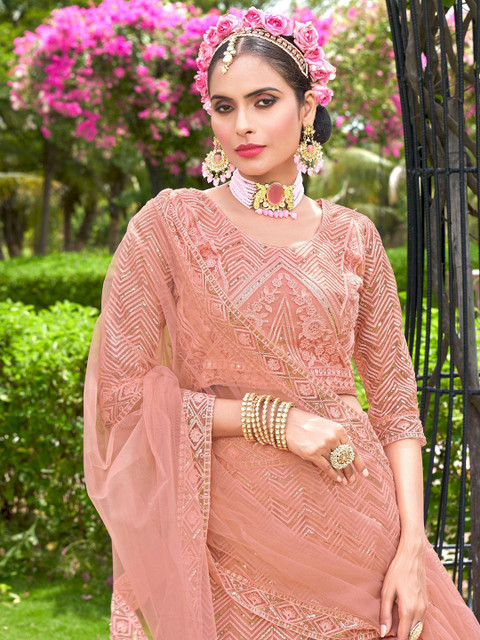 Varni Fabrics Women Net Peach Color Embroidered Lehanga Choli Set Peach Color Lehenga Choli