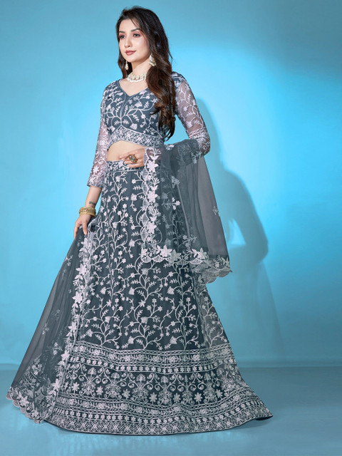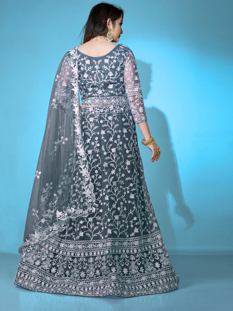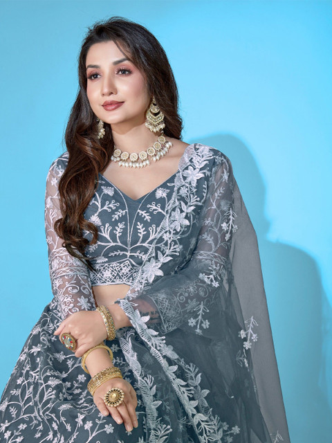 Grey and silver-toned embroidered lehenga choli with dupatta,