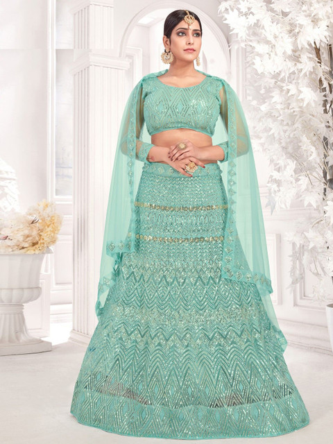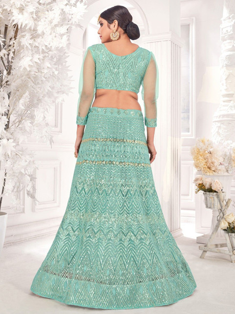 Varni Fabrics Women Sea-green embroidered net semi stitched lehenga Green Color Lehenga Choli