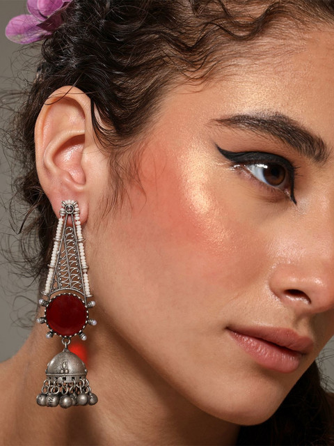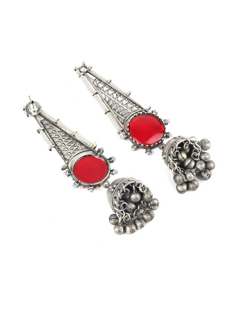 Sliver-toned, red and white earrings, has dome shaped jhumka artificial stones studded and beaded details