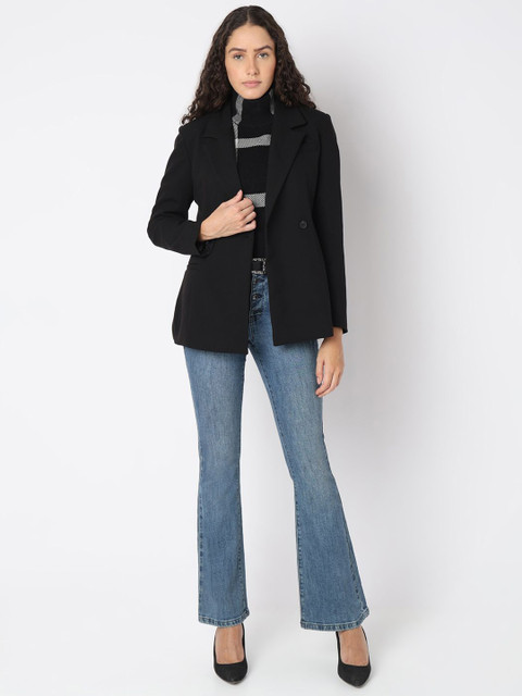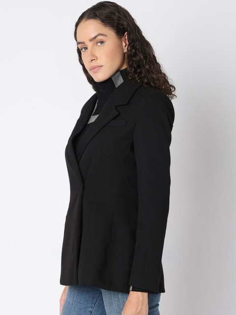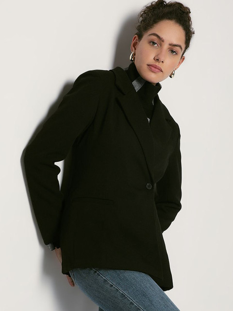 Black solid regular-fit formal blazer, has a notched lapel, long sleeves, single-breasted with single button closure, one pocket and a ventless back hem