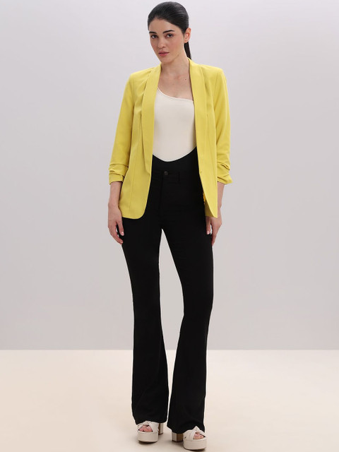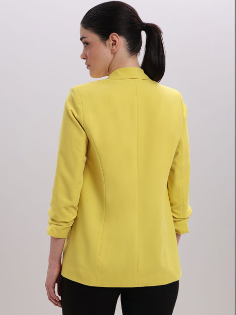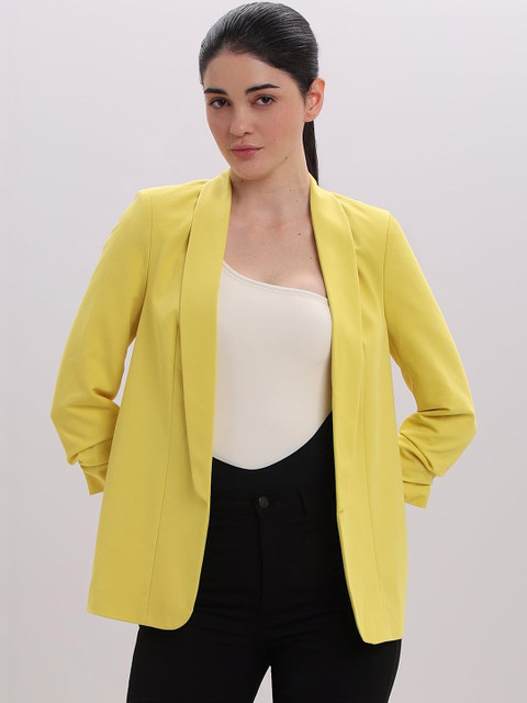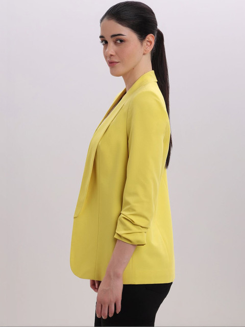 Yellow solid slim-fit casual blazer, has a shawl collar, long sleeves, single-breasted with single button closure, two flap pockets, one welt pocket and a ventless back hem