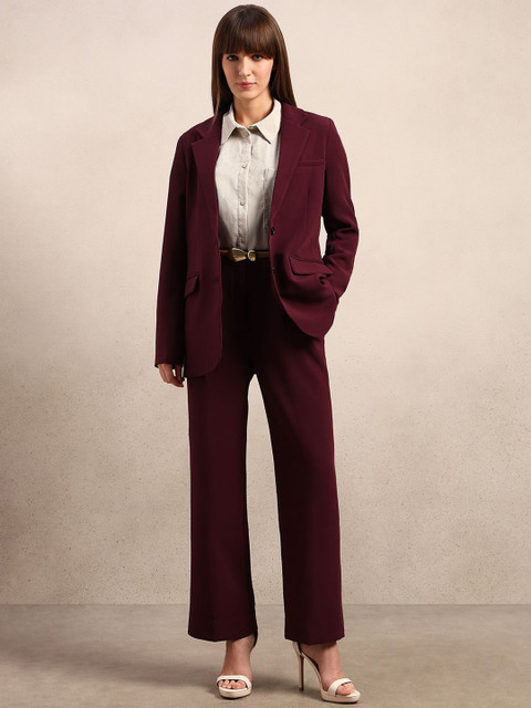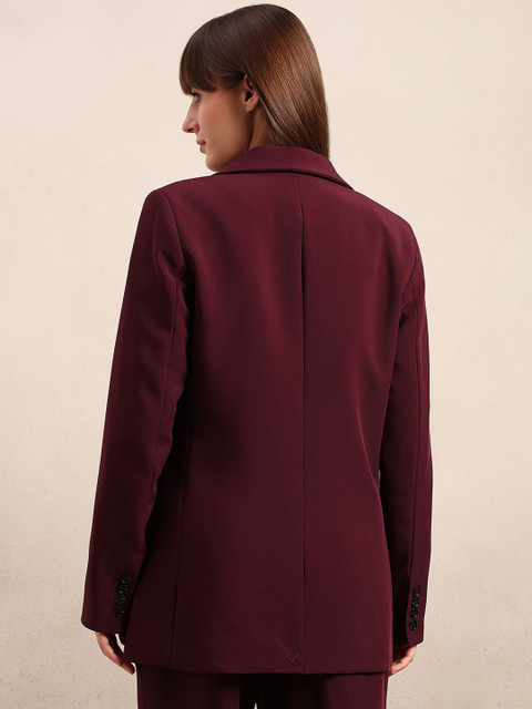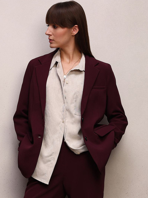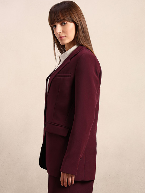 Marron solid tailored Fit casual blazer, has a notched lapel, long sleeves, single-breasted with double button closure, two flap pockets, one welt pocket and a ventless back hem