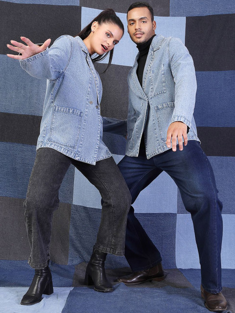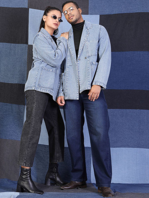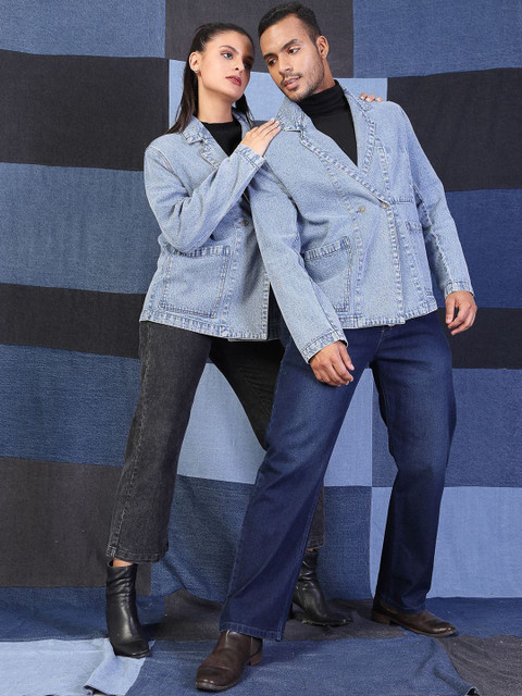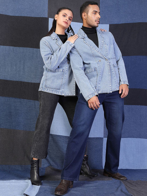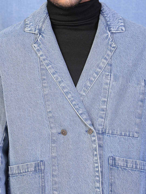 Blue solid oversized fit double-breasted blazer, has a notched lapel collar, long sleeves, ventless, button closure with straight hem & two pockets