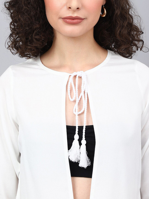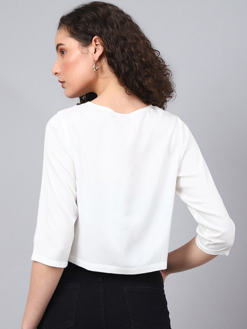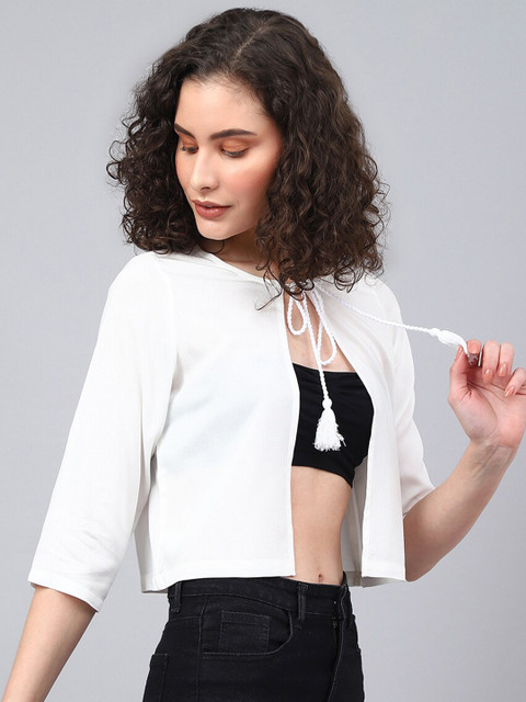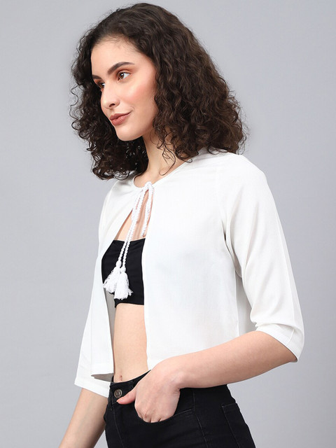 White solid open front crop shrug ,has three-quarter sleeves, straight hem