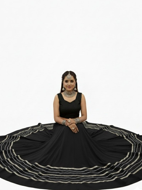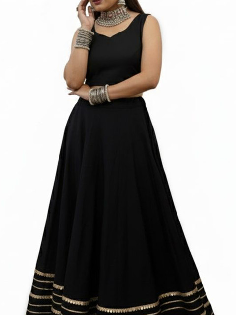 Black solid unstitched blouse, sleeveless, black solid ready to wear lehenga, flared hem