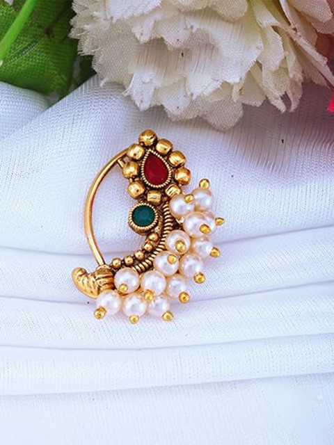 Gold-toned, white & red gold toned cubic zirconia pearl beaded stud nosepin with insert closure