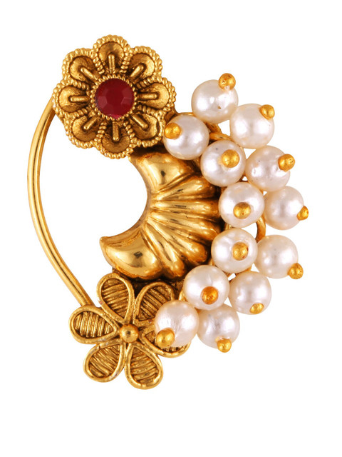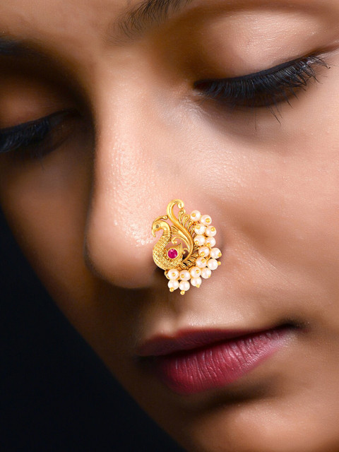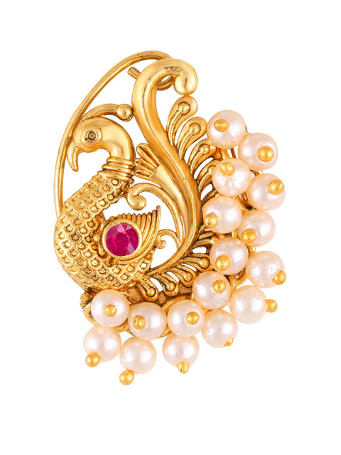 Gold-plated pink stone-studded and white pearl beaded nose pin with textured detail