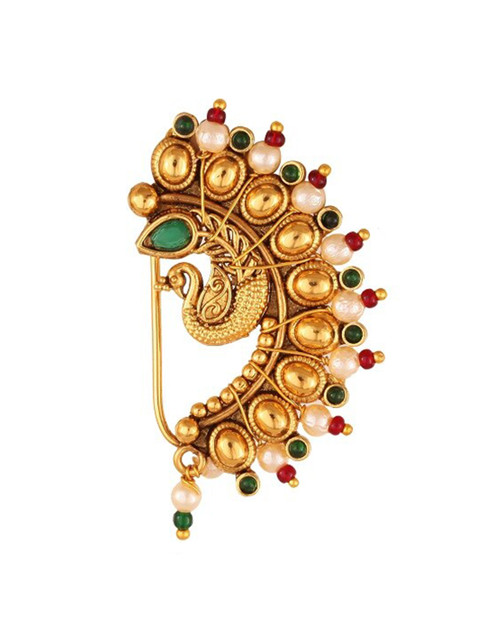 Set of 2 Gold-plated nose pins, each has white and red stone-studded and pearl beaded detail, each secured with a insert closure