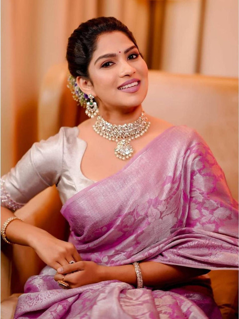 - Purple and silver-toned kanjeevaram saree
