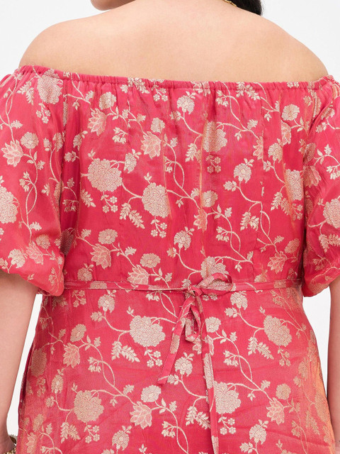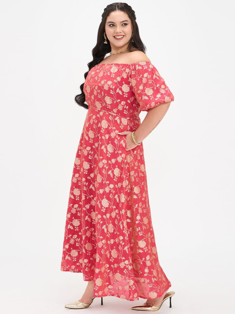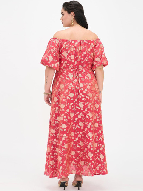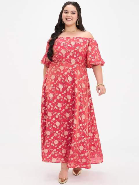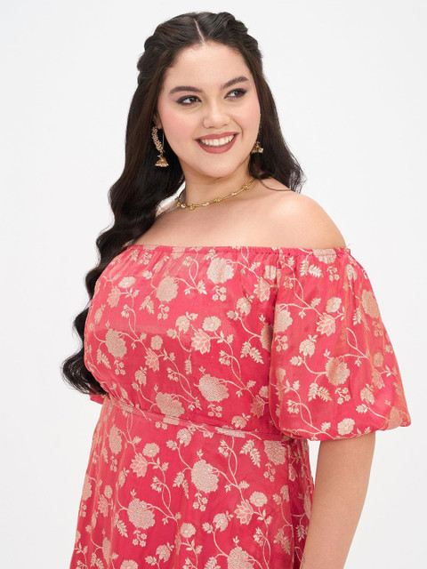 Cut from rich brocade this off shoulder plus size maxi dress for women balances structure with fluidity. The fitted bodice extends to a defined waistline before opening into a full floor length flare. Short sleeves frame the neckline while a tie belt at the waist adds an element of versatility for cinching. With its elegant lines and brocade sheen the dress is designed for sophisticated festive moments.