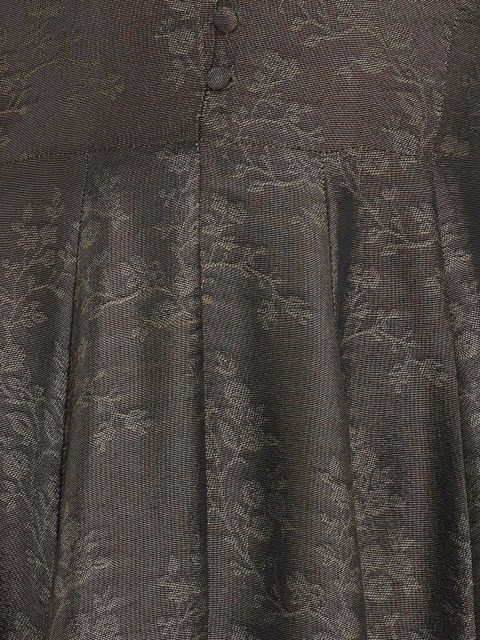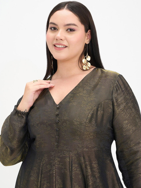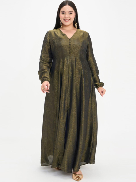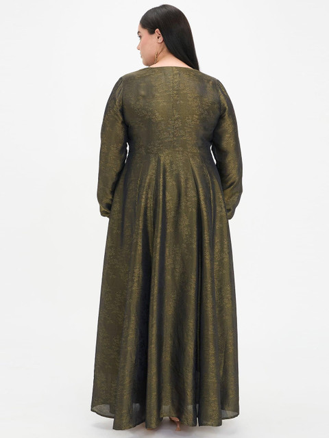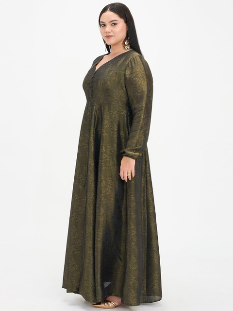 This golden maxi dress for plus-size women features a flared silhouette for elegant movement and a floor-length design for a striking presence. Crafted in viscose brocade jacquard fabric, it showcases rich Indian heritage texture with self-fabric center-front buttons and a front slit for added grace and ease of wear. Perfect for festive occasions and special celebrations