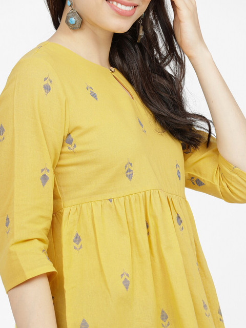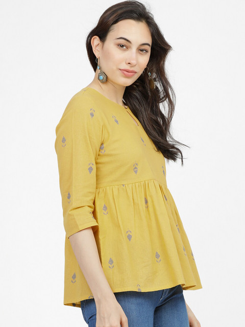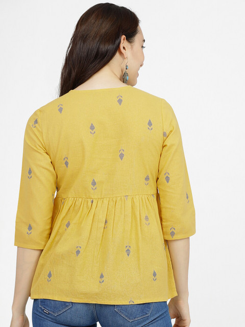 The Vishudh Mustard & Blue Ethnic Motifs Printed Cotton Top is a perfect mix of comfort and ethnic charm. The pure cotton fabric feels soft and breathable, ideal for daily wear or festive casuals. The print is vibrant yet elegant, and the empire cut gives a flattering fit. Pair it with jeans or leggings for a stylish, Indo-western look!