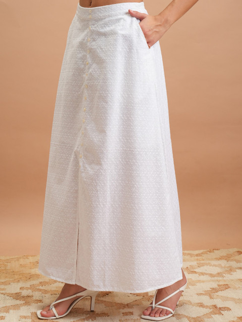 White embroidered midi skirt has partially elasticated waistband with button detail, side pockets, front slit and straight hem