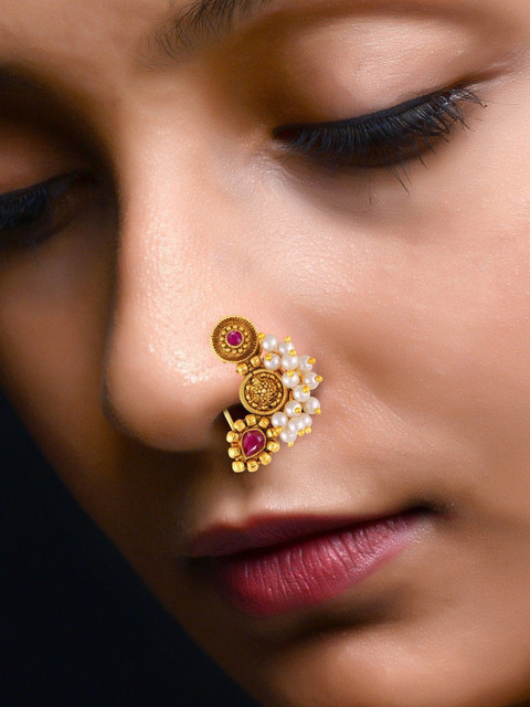 Gold toned, pink and white nath nose pin, has cubic zirconia studded and beaded details