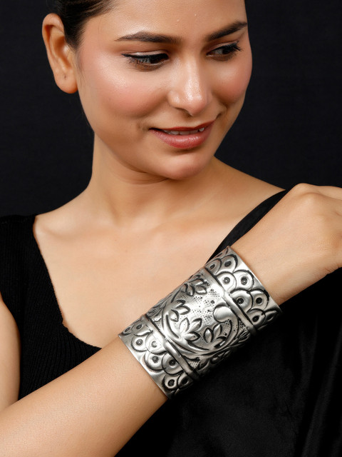 German silver-plated rajasthani bangles, has flower shape details, secured with slip-on closure