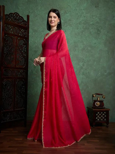 The material is not chiffon but somewhat tissue kind and shade is not perfect red but has dual tone of red and pink but overall a good purchase I like it.