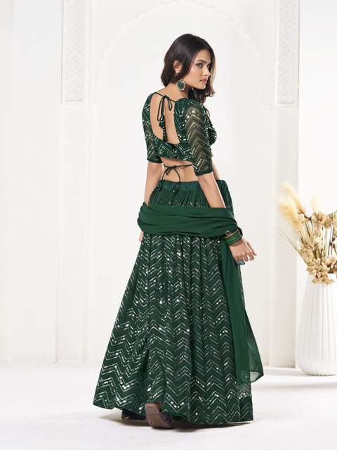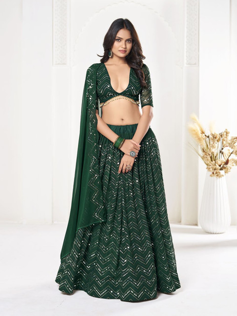 Green and silver-toned embroidered lehenga choli with dupatta, sequinned