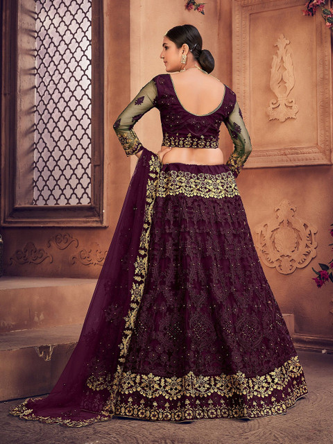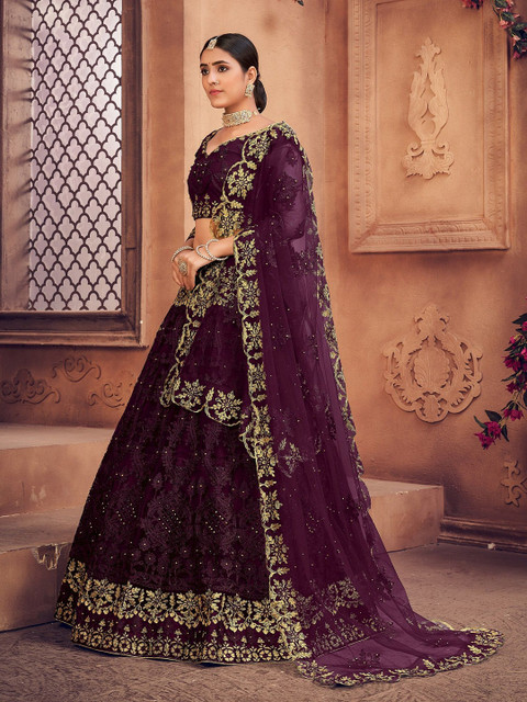 Purple and gold-toned embroidered lehenga choli with dupatta, thread work