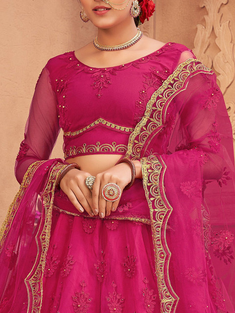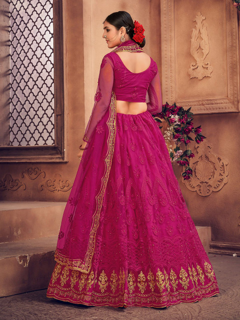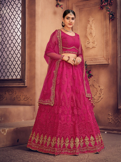 Pink and gold-toned embroidered lehenga choli with dupatta, thread work