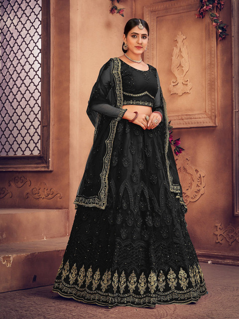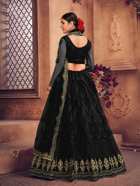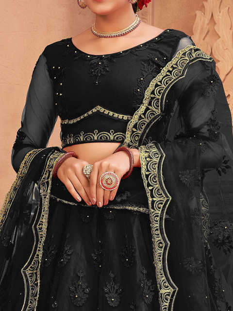 Black and gold-toned embroidered lehenga choli with dupatta, thread work