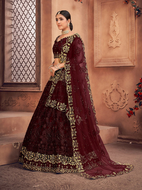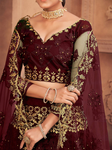 Maroon and gold-toned embroidered lehenga choli with dupatta, thread work
