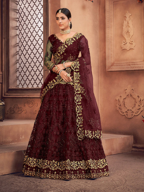 Maroon embroidered semi-stitched lehenga, has zip closure, flared hem