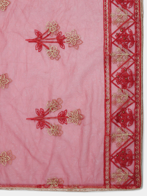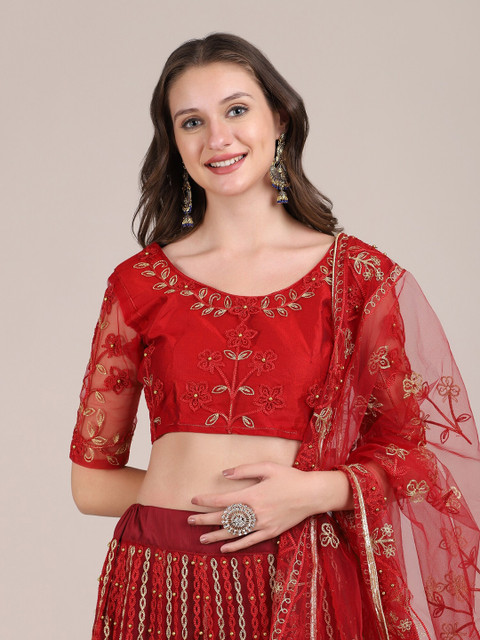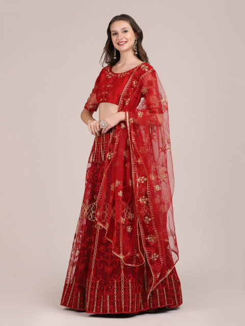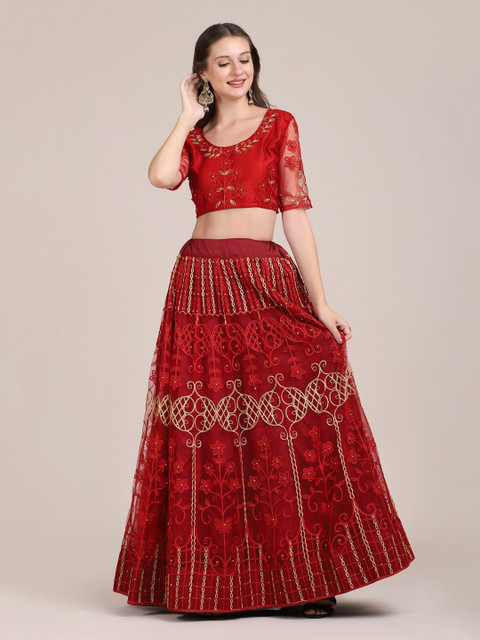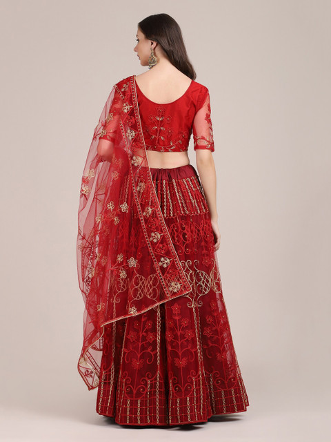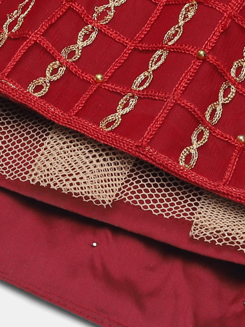 - Maroon and gold-toned embroidered lehenga choli with dupatta,